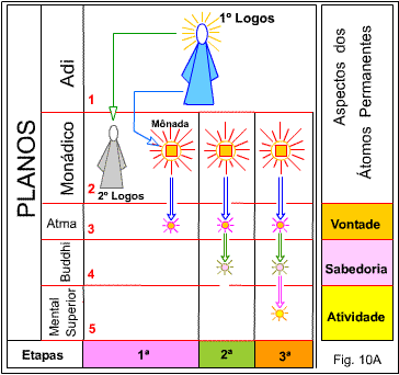 Uma vez a "sonda" ali instalada, agrega-se à ela as substâncias pertencentes e que melhor caracterizam aquele plano. Esse agregado fundamenta na Mônada, via "sonda", o aspecto VONTADE. E´ o que na figura indicamos por 1ª Etapa.