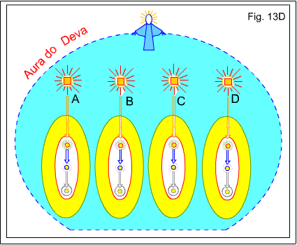 Todavia, como se observa na figura 13D abaixo, apesar das Mônadas se isolarem umas das outras, seus atributos de manifestação continuam revestidos por parte dos átomos daquela "casca de ovo" que dela iniciamos a falar na apostila 11.