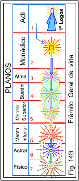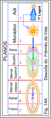 Agora, complexas operações se iniciam. Mudando nossa visão para a figura que se segue, 14A, vemos que, na primeira das operações, o fluxo monádico do raio de vida se intensifica, e a Tríade Superior se torna mais brilhante. Fulgurante.