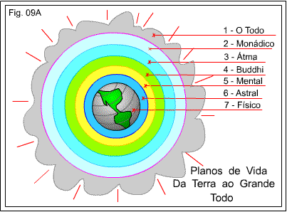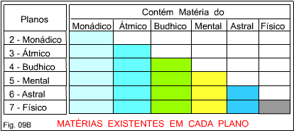 Exemplifiquemos, usando o gráfico abaixo: Interpenetrando o plano físico da Terra, ou o sétimo, estão todos os demais.; ao passo que com relação ao plano Mental, o quinto, interpenetrando-o só se acham os planos Búdhico, Átmico e Monádico. Como o gráfico demonstra, no plano Mental não se encontram matérias dos planos Astral e Físico.