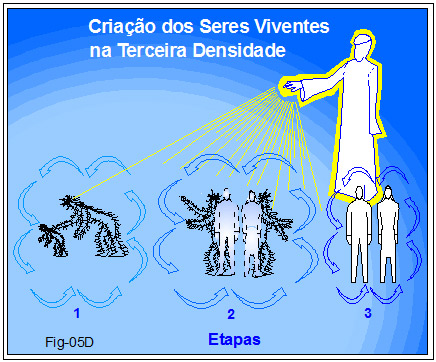 Figura 05D simboliza a criação de seres viventes, humanoides, na terceira densidade. Etapas: 1 – primitivos; 2 – a transição primitivos/homo sapiens; 3 – homo sapiens/sapiens.