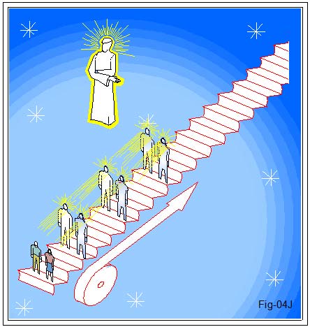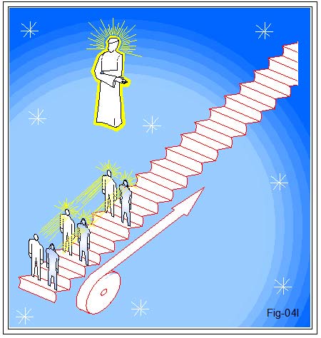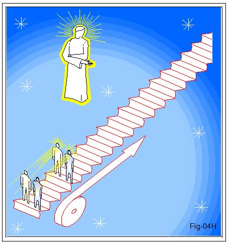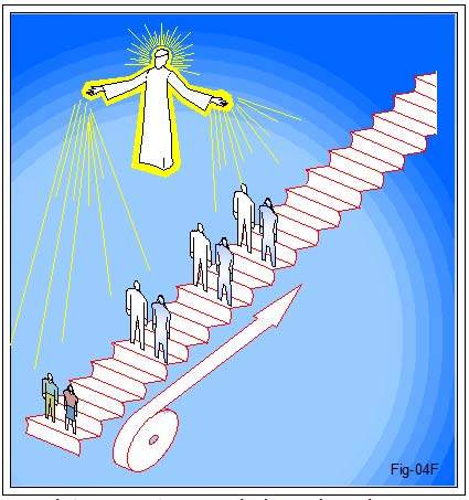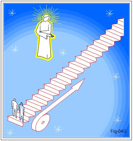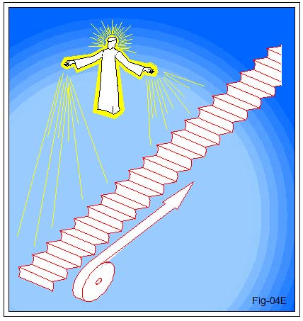 Mais magnificente, ainda, é tudo isso ser imaginado da seguinte maneira: Ele deu a “Partida”. Seres vieram à existência. A escada rolante iniciou sua incessante movimentação ascensional. Figura 04F. Os primeiros embarcados foram “subindo”. Aí, Ele “cruzou os braços”. Figura 04G.