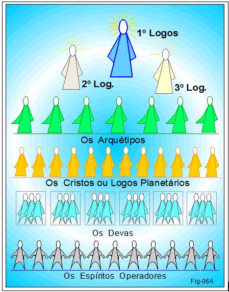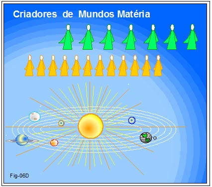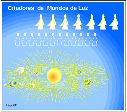 Atribuídas à arte da criação estão várias Ordens de Espíritos. Desde aquelas que podemos classificar de mais superiores, decrescendo àquelas que mais de perto atuam nos universos matéria, e nestes, junto a sistemas galácticos e planetários como o nosso. Figura 06A.