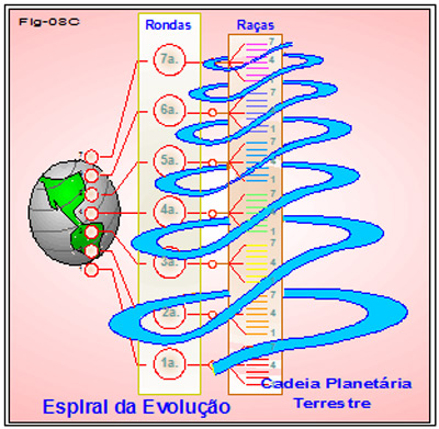 E aconteceu, e aqui estamos neste gigantismo existencial, que, apesar das dificuldades por entende-lo no todo, nos é dado, porém, conhecer, na linguagem do esoterismo, a embrionagem de nossas origens e o percurso cíclico e espiralado que até aqui já percorremos. Figura 08C. Como, ainda, por similaridade com as outras Cadeias Planetárias, visualizar o que nos falta percorrer neste mesmo cenário.
