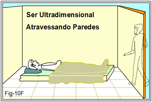 Cabe também aqui registrar que os seres Ultradimensionais, como já os vimos na apostila 02, por habitarem outras dimensões que não a terceira e, naturalmente, tendo seus corpos compostos por partículas correspondentes ao ambiente nativo, isto é, matéria sutil, quando em visita à terceira dimensão também se beneficiam por perpassar paredes ou outros obstáculos que para nós são impeditivos. Figura 10F.