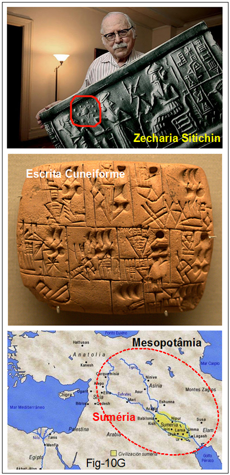 Da série As Duas Vertentes, as apostilas 18 à 20, tratam da pesquisa efetuada por Zecharia Sitchin com a decifração das tablitas de argila encontradas nas escavações arqueológicas dos povos sumérios e acadianos. Toda a pesquisa e análise dos antigos textos estão publicadas nos livros da série Crônicas da Terra, dele mesmo, Sitchin. Figura 10G. (Ver bibliografia)