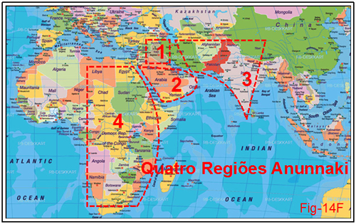 Para acomodar a situação entre eles, numa tentativa de paz, subdividiram todo o território sob seu controle em quatro regiões. Continente africano, atual oriente médio, atual península arábica e sudoeste asiático. Figura 14F.
