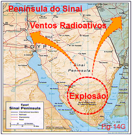 Pesquisas arqueológicas evidenciam que a península do Sinai foi, literalmente, arrasada por artefatos nucleares, como atestam as rochas vitrificadas lá encontradas. Figura 14G.