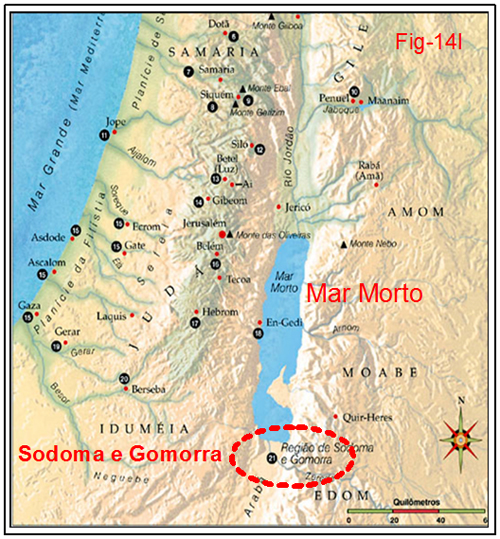 O mapa da figura 14i mostra o local onde se situavam Sodoma e Gomorra. Bem ao sul do Mar Morto que faz fronteira entre Israel e a Jordânia.