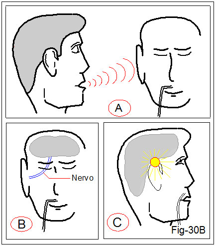 Nesta outra figura, 30B, procuramos mostrar o desdobrar do que acontece numa comunicação falada. Quadro “A” – As ondas sonoras provocadas pela voz do brasileiro chegam ao ouvido do chinês. Neste primeiro momento é apenas um barulho. Quadro “B” – Uma vez atingindo o ouvido, pelo mecanismo de transferência próprio do sistema auditivo do corpo humano, aquelas ondas sonoras se transformam em impulsos elétricos e, viajando através dos nervos da audição, chegam ao cérebro do ouvinte. No caso, o chinês. Até aqui, todo o fenômeno está ao nível exclusivamente físico. Sigamos ao outro quadro. Quadro “C” - Percorrendo a região adequada do cérebro, aqueles sinais elétricos passam por outra transformação e tomam novo rumo.