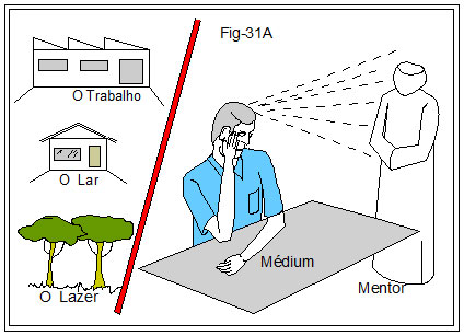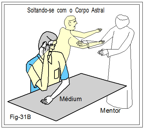 A figura 31B representa a soltura do corpo Astral do médium no momento em que ele se acha favoravelmente concentrado. Solta-se e vai de encontro aos interesses que ali o atraem. Cabem aqui duas explicações: A primeira: nesta soltura o corpo Astral não se distancia muito do corpo Físico. Afasta-se só o suficiente para permitir que alguma entidade possa se acoplar ao seu corpo Físico, mantendo sobre este, porém, total controle através do cordão de Prata. Segunda: Como o corpo Astral se acha interligado ao corpo Físico via cordão de Prata, (ver apostila 12), as sensações recebidas no plano Astral também atingirão o corpo Físico. Nesse caso, havendo regular disciplina, e como o corpo Físico é apenas mais um instrumento da consciência, ao comando dela, ou sob a influência de alguma entidade, o médium retransmitirá pela voz, e gestos, as impressões captadas naquele plano. Algum tempo à frente, quando esse indivíduo for inteiramente dócil ao ato de intercâmbio com os planos extrafísicos, permitirá não só a comunicação verbal que outra consciência emitir por seu intermédio, mas também que ela exerça o inteiro comando de seu corpo Físico. Digamos assim, permitirá uma substituição do agente controlador do veículo físico. Desta forma, a ação motora do corpo, como complemento da comunicação, será inteiramente acionada pelo manifestante. Numa etapa mais avançada de seu aprimoramento, poderá conseguir comunicações com níveis mais elevados. Estas, através do corpo Mental. (Ver apostila 17).