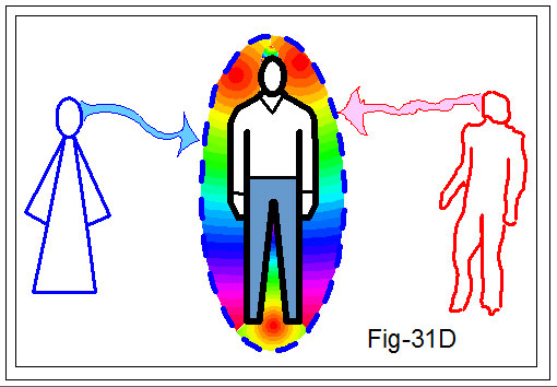 Esta outra figura, 31D, mostra esse momento. A aura do médium detecta as vibrações estranhas que lhe chegam. Transmite as impressões ao Duplo Etérico que via chacras as associa ao corpo Físico. As emanações pesadas provocam no médium, como reação, enjôos, náuseas, taquicardia (coração palpitando), irritabilidade, apetite descontrolado, desânimos. Naqueles não esclarecidos, além dos sintomas citados, também provocam a depressão, o enraivecimento brutal, os atos de violência e incontrolabilidade sexual. Tudo isso provocado por agentes externos à vontade pessoal do médium que disso não se apercebe.