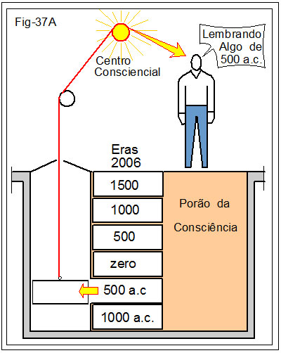 Pelo “elevador”, e transitando pelo Centro Consciencial, chegarão à personalidade física, atual, as lembranças que poderão vir na forma de intuições, visões, sonhos ou comportamentos. Na figura, nosso personagem recorda ocorrências do ano 500 a.c., correspondendo à posição em que se encontra o “elevador”.