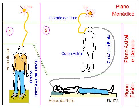 Mas seguindo em nossa exposição, e ainda com foco na figura 47A, como ficou visto na apostila 11, o indivíduo possui vários corpos, situados, cada um num plano específico.  Durante o dia seus diversos corpos se acham acoplados ao corpo Físico.  Por isso, todas as atenções, ou estado de consciência, se voltam exclusivamente para as atividades da vida humana.