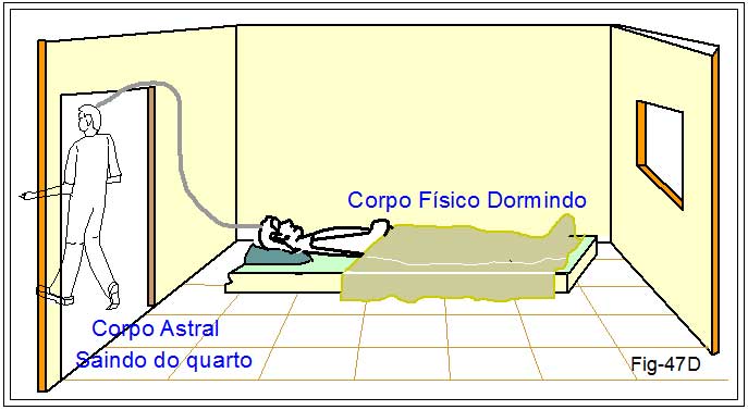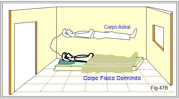 Tendo o corpo Astral toscamente desenvolvido, o que significa sm recursos para mais liberdade no plano Astral, permanece a consciência quase inativa.  O corpo Astral permanece a flutuar ligeiramente sobre o Físico, enquanto este dorme.  Interligados pelo cordão de prata, assim ficam os dois corpos durante o tempo em que durar o sono. É isso que nos demonstra  a figura 47B.
