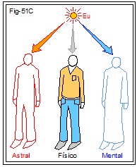 A figura 51C demonstra que a criatura é composta do Eu Verdadeiro acompanhado de seus diversos corpos que, para simplificar, representamos apenas três. Cada corpo tem seus respectivos centros de energia, ou chacras. (Chacras, vide apostilas 21 à 25).