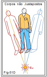 A figura 51E nos exibe os dois momentos: quadro 1, situação vista acima, em que a pessoa se encontra descompensada. Os corpos Astral e Mental não estão acoplados ao Físico. Entretanto, dando inicio aos treinamentos de meditação eles vão se juntando, justapondo-se; quadro 2, situação de equilíbrio, corpos justapostos, o que é conseguido com a prática da meditação.