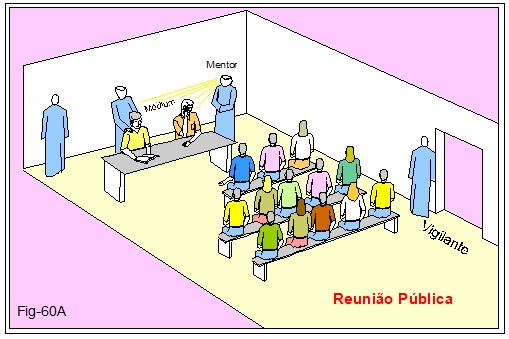 A figura 60A representa o encontro fraternal denominado de reunião pública.   Nela, de forma simples, procurou-se representar as várias categorias de frequentadores.
