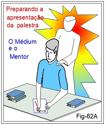 Respondemos: A oratória tam-bém está intima-mente ligada à mediunidade. Conforme a figura 62A mostra, desde o início da preparação do tema, que deve ser feita dias antes da data da apresentação, os Espíritos que participam daquela atividade, naquele grupo, já estarão envolvendo o médium apresentador. Inspirando-lhe.