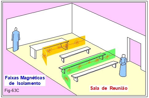Tão logo termina a higienização energética do ambiente, a equipe de operosos trabalhadores do espaço, inicia a colocação, ou formação, de faixas magnéticas. (Figura 63C).