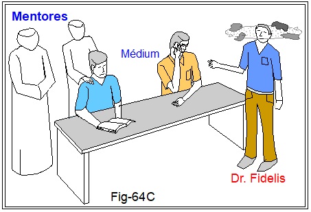 O mentor já a postos aguarda a resolução da conversa, enquanto, com seus fluídos envolve o médium e o dirigente.