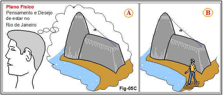 Na figura 05C, Quadro A, a Consciência em estado físico pensa e deseja estar na cidade do Rio de Janeiro. Esse pensamento passa a se constituir em imagem. “Energia viva, o pensamento desloca, em torno de nós, forças sutis, construindo paisagens ou formas, e criando centros magnéticos ou ondas, com os quais emitimos a nossa atuação ou recebemos a atuação dos outros.” (Emmanuel, livro Roteiro, psicografia de Francisco Cândido Xavier, editado pela Federação Espírita Brasileira – página 120).