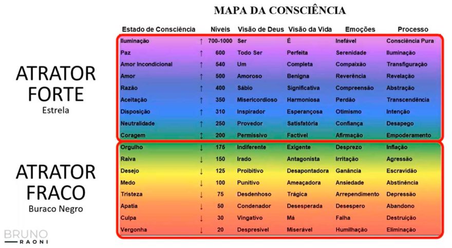 Esse mapa é chamado de Escala Hawkins de Consciência e foi criado por meio da cinesiologia, estudo que engloba diferentes disciplinas e possui o objetivo de entender o funcionamento e as forças que agem sobre o corpo humano e manipular tais forças, para que assim o ser humano também tenha uma melhor performance.